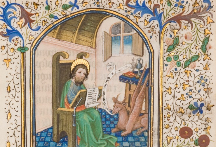 Flemish Master of the Gold Scrolls, St. Luke Writing His Gospel (detail), c. 1430-1450. Illuminated manuscript.