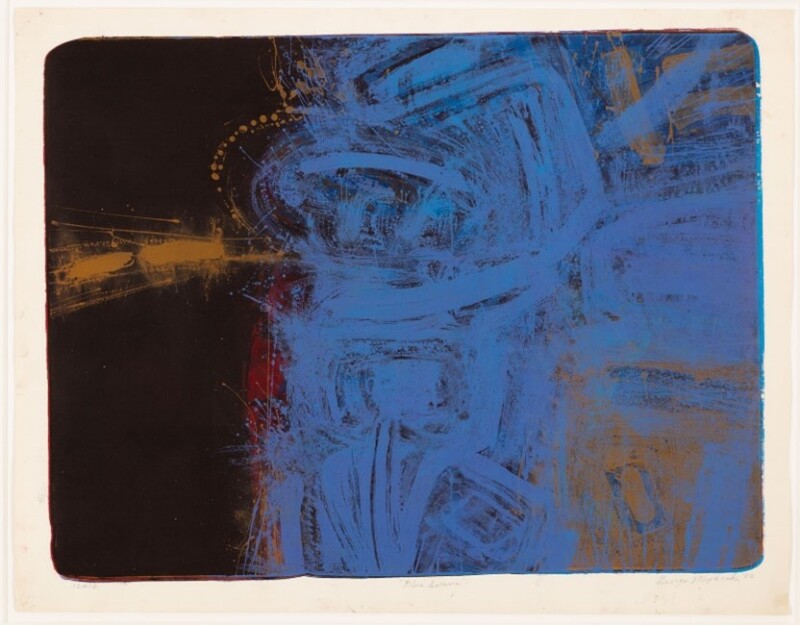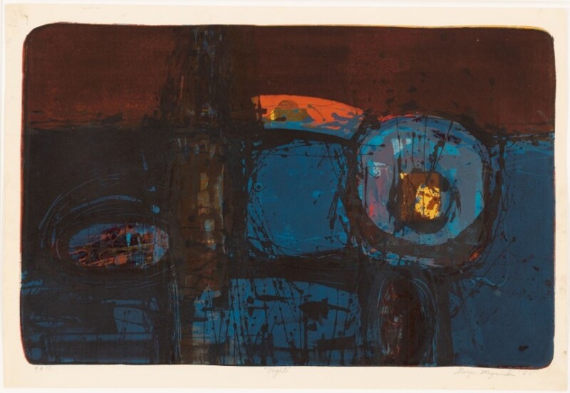 Miyasaki was born in Hawaii in 1935 to Japanese parents. In 1953, Miyasaki moved to Oakland, California at the urging of his high school art instructor to study art. The two works by Miyasaki in the Thrivent Collection are both early-career lithographs, made while he was still in college in the mid-1950s. Night and Blue Serene demonstrate the randomness of his markings and the gorgeous texture he achieved by layering soft shapes and forms over fields of color. Choosing to evoke the natural world through abstract, spontaneous gesture was a different approach than many other abstract expressionist artists at the time, who instead sought to express their own inner psychology. Miyasaki prided himself on not following fads or the current trends in art. Miyasaki’s early printmaking was criticized at first for being “too painterly,” but later was celebrated for introducing brushwork in his prints.