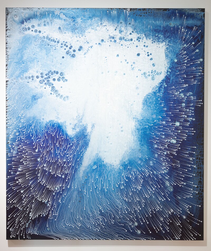 Barbara Takenaga combines scientific inquiry and abstracted imagery reminiscent of nature in her work to evoke momentum and magnetism. Takenaga improvises by pouring paint onto the canvas, allowing unpredictable areas of color to appear. Then, she adds pattern and form to create immersive color and swirling energy. Takenaga’s imagery offers a compelling mix of ordered detail and free-flowing abstraction.