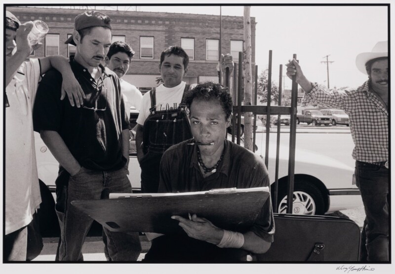 This image from the series captures a fellow artist at work. Like most of Huie’s work, this photo is a snapshot of a moment—a slice of daily life from a particular time and place. Like any snapshot or moment, it belongs to a longer narrative. Who are the individuals standing behind the artist? Perhaps they are friends, family members, or passersby on Lake Street. The draughtsman’s piercing gaze confronts us directly. It feels as though we are the subject of his work. Then we remember that this is a photograph. He is peering not at us, but at the photographer’s camera lens. In this moment, he and Huie are both artist and subject.