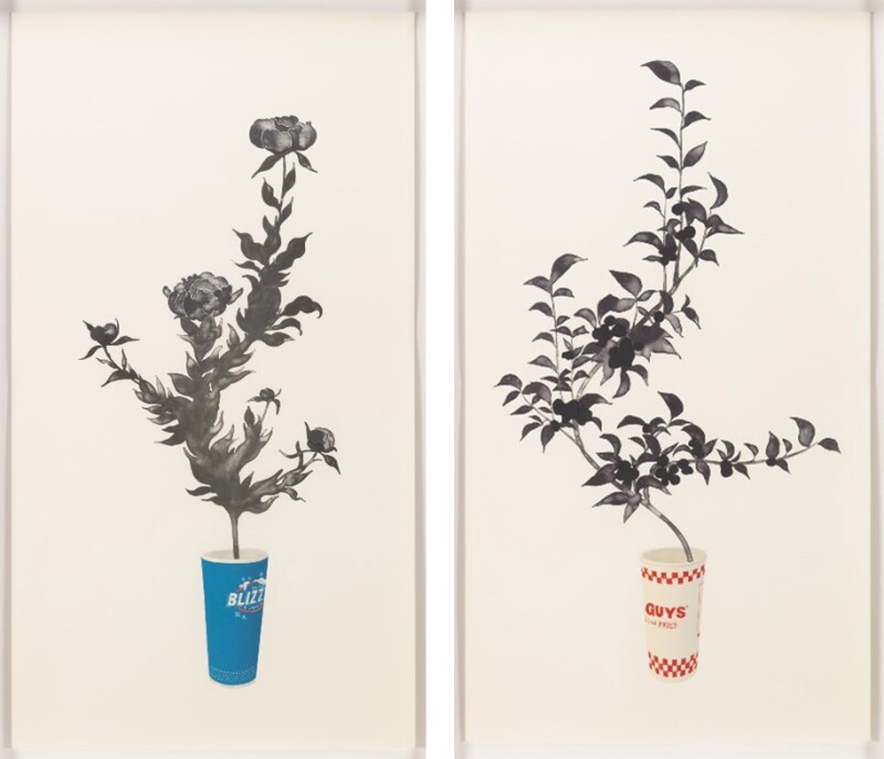 She explores the tension and dialogue between the disposable and impermanent nature of material objects—including their persistence and reusability. Simple floral arrangements, placed in various disposable objects, are a recurring motif in the artist’s original prints. In Blizz and Guys and Fries, flowering leafy branches are placed inside fast food paper cups that serve as make-shift vases for the elegant arrangement. Like the disposable cups, the plants carry a sense of impermanence—how long will they thrive in these containers? Nam emphasizes the contrast between organic and human-made materials by rendering the flowers in monochromatic gray tones and reserving a full color treatment for the restaurant cups and their emblazoned logos.