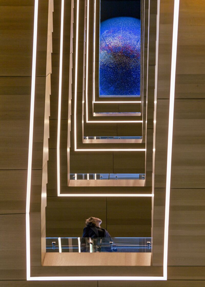 At the top of the glass-encased staircase at Thrivent’s Minneapolis Corporate Center hangs a dazzling portrait of the heavens. Its shimmering form draws attention, compelling people to crane their necks for a better look and inviting them to take a seat and stare awhile.